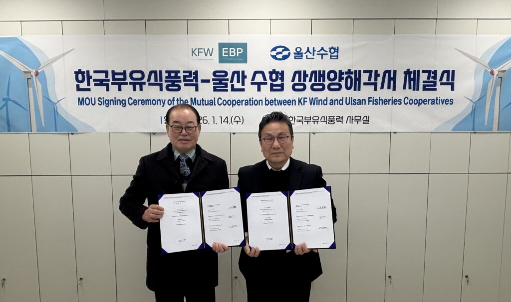 한국부유식풍력(Korea Floating Wind, KFWind; 이하 케이에프윈드)은 지난 14일 울산광역시 남구에 위치한 케이에프윈드 사무실에서 울산수산업협동조합(이하 울산수협)과 부유식 해상풍력 개발과 지역 어업이 조화롭게 공존할 수 있도록 상생협력 양해각서(MOU)를 체결했다.